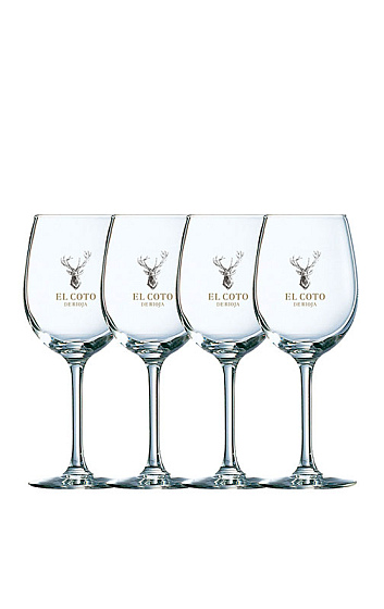 Disfruta de estas cuatro copas perfectas para apreciar como se merecen los vinos de esta casa emblemática de Rioja. El Coto es una de esas casas de referencia a las que acudimos siempre que podemos, pues sus vinos son un acierto seguro en los que confiar en cualquier ocasión. Las copas vienen serigrafiadas con el icono de la marca.