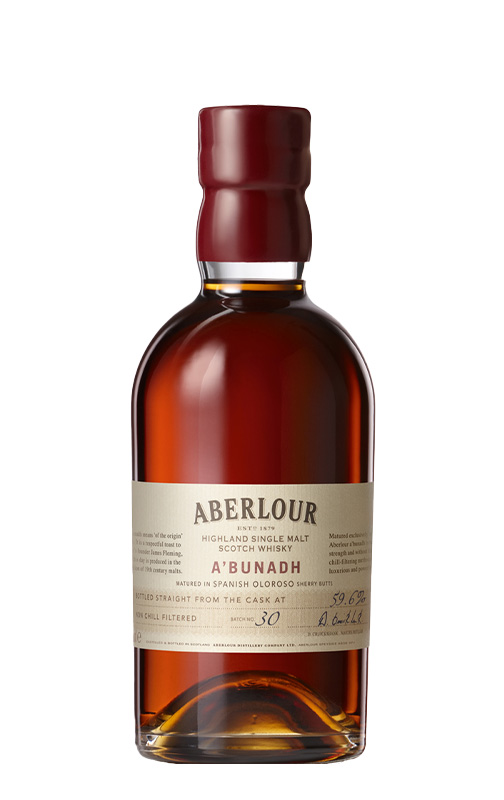A'Bunadh significa "original" en gaélico, lo cual ya es toda una declaración de intenciones para este whisky elaborado exclusivamente mediante métodos tradicionales, obteniendo cada partida cuidadosamente a mano. Estamos ante un whisky de barril que ha conseguido un estatus de culto entre los mayores expertos de esta bebida. Un homenaje al fundador de la célebre casa Aberlour, James Fleming, que destaca por ser más cremoso e intenso que la mayoría de whiskies escoceses.