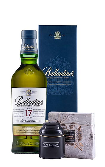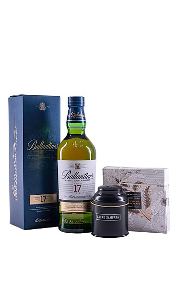 Un pack increíble que incluye un estuche de Ballantine’s 17 años, un bote de cacao artesanal Sampaka y una elegante caja de bombones de la misma marca, elaborados a partir de cacao africano.