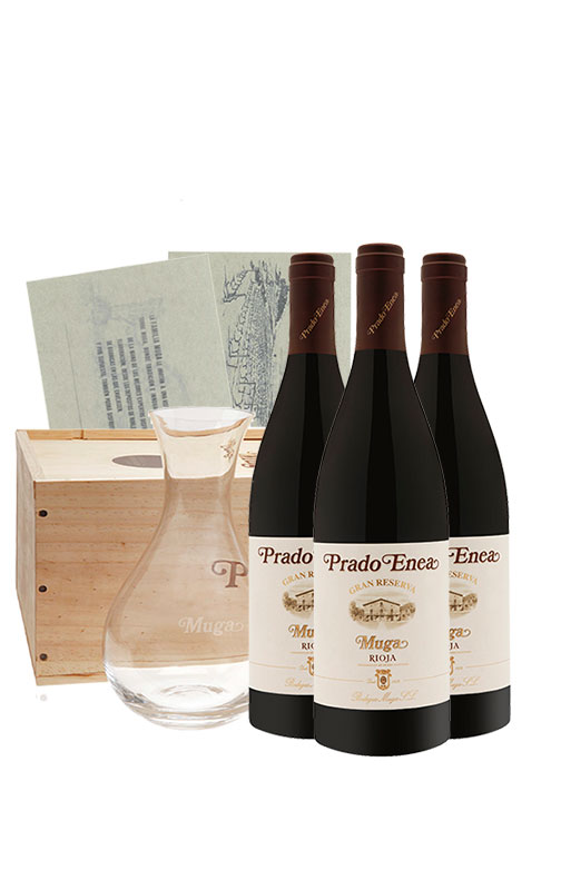 Fundirse en la filosofía de una de las bodegas de mayor prestigio de Rioja es fácil con este pack especial. El lote está formado por 3 botellas del tinto Prado Enea Gran Reserva 2006 (93 Peñín), presentadas en un elegante escuche de madera. Vienen acompañadas de un decantador de cristal de Bohemia y una tarjeta para dos personas con la que podréis disfrutar de una visita con cata incluida en las instalaciones de bodega (valorado en 50€).