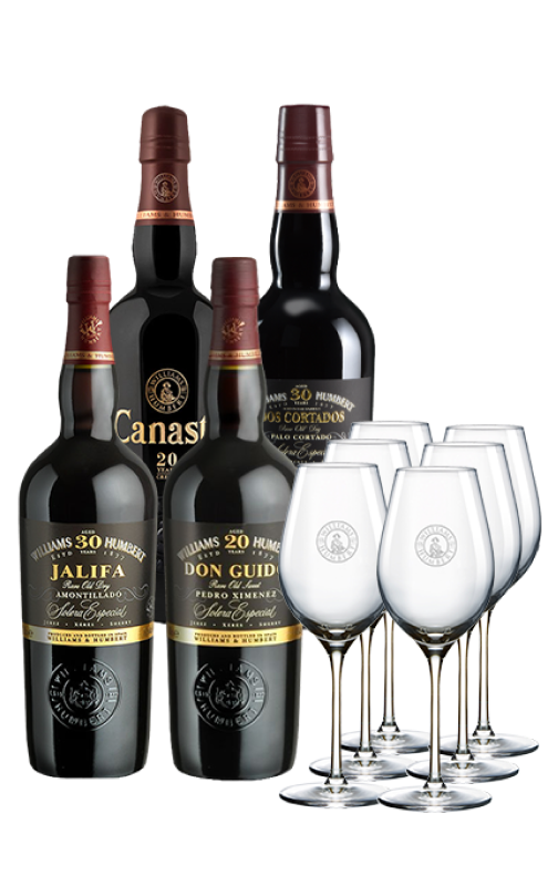La mítica bodega jerezana Williams & Humbert ofrece un espectacular estuche para disfrutar de su colección Solera Especial. Esta reúne en cuatro botellas acompañadas de seis copas serigrafiadas, algunos de los estilos míticos que han convertido a estos generosos en leyendas enológicas de nivel mundial, desde su amontillado Jalifa hasta el Canasta 20 años, pasando por el palo cortado Dos Cortados o el PX Don Guido. Puro arte jerezano.