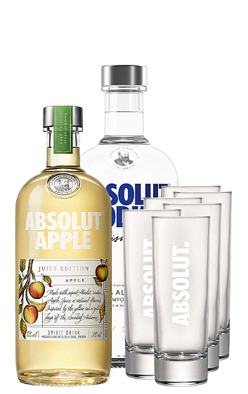 Absolut Vodka 70cl y Absolut Juice Apple con 6 Copas Tubo Absolut de regalo
