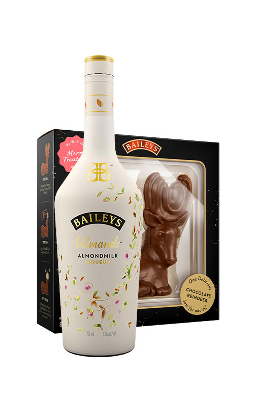 El Baileys elaborado con esencias de almendras unido al dulzor del reno de chocolate que forma parte de este pack, son una combinación imprescindible para degustar durante el período navideño. Sus notas de almendra, vainilla y crema de whisky, junto al chocolate con leche del reno te volverán loca.