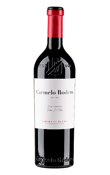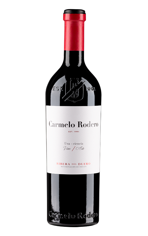 Tinto fino (Tempranillo) y pequeños aportes de Cabernet sauvignon, Merlot y Albillo constituyen el coupage de Carmelo Rodero. Aunque conserva la tirilla oficial que certifica su categoría, la referencia prescinde de la palabra Crianza en su etiqueta para reafirmar su identidad y personalidad propias. Todo ello sin modificar la elaboración y perfil de este auténtico clásico de Ribera del Duero, elegante, complejo, goloso y equilibrado, con la firma de la enóloga de la casa burgalesa, afincada en Pedrosa de Duero, Beatriz Rodero.