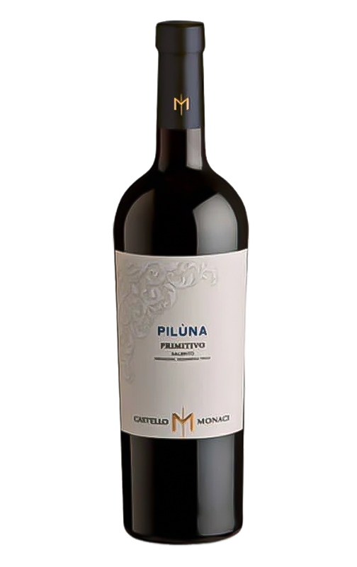 Castello Monaci Pilùna es un monovarietal de Primitivo originario de Salento. Su leve paso por barrica de 6 meses no enmascara la carga frutal de esta uva típica de la Puglia caracterizada por su intensidad de frutos rojos y negros, notas especiadas de pimienta negra, canela y clavo, sus taninos presentes pero suaves y jugosidad en boca.