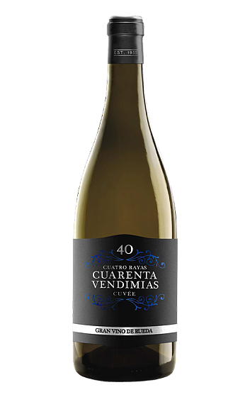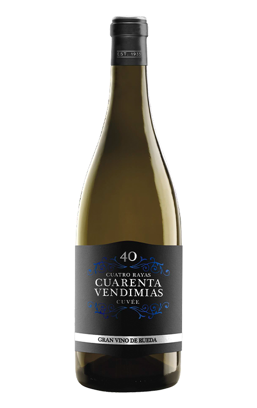 Cuatro Rayas Cuarenta Vendimias Cuvée es un blanco elaborado con uva Verdejo procedente de algunos de los viñedos más viejos y valioso de la bodega. Este vino de guarda cuenta con la categorización de Gran Vino de Rueda establecida por el Consejo Regulador de la D.O. y en vigor desde la añada 2020. La clasificación distingue a aquellos vinos cuyos viñedos de origen tengan mas de 30 años y presenten unas características de calidad singulares. Gracias a su crianza sobre lías y su paso por barrica es un blanco fresco y complejo ideal para descorchar ahora o para una larga guarda en bodega.