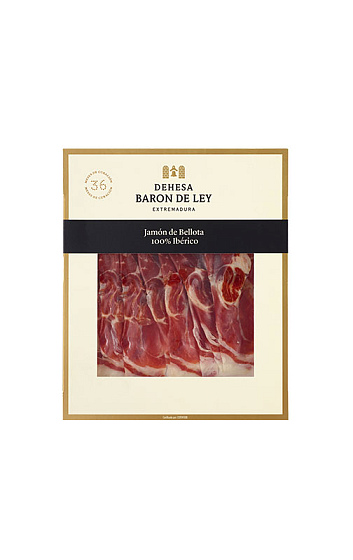 Jamón de Bellota 100% Ibérico de Dehesa Barón de Ley elaborado con la extremidad posterior, cortada a nivel de la sínfisis isquiopubiana, con pata y hueso, que incluye la pieza osteomuscular integra, procedente de cerdos de raza ibérica adultos alimentados exclusivamente de bellotas. El jamón ha sido sometido al correspondiente proceso de salazón y curado-maduración, loncheado y envasado al vacío.