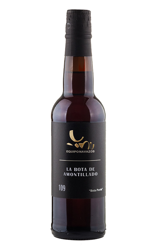The NV La Bota de Amontillado Bota Punta 109 is a very old wine they selected from the cooperative of Trebujena that had never been bottled before. The cooperative was created in 1970, but one of the members had these butts from before; their history was really unknown, but the wine has a profile of coastal Amontillado (from Sanlúcar or Trebujena) with less glycerin, sharp and saline, not as sharp or as bitter as the iconic NPI but with crazy numbers—alcohol, acidity, dry extract and everything. It's very intense but very balanced. An amazing wine that should live forever. It was bottled into 1,200 half bottles (one bota) in October 2021.