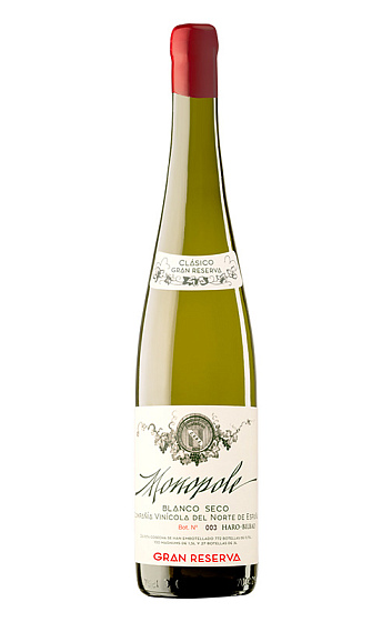 Este Gran Reserva totalmente sui generis es una vuelta de tuerca más en la recuperación del clásico Monopole de CVNE elaborado a la vieja usanza. Viñedos de Viura de muy bajo rendimiento son el punto de partida de este blanco envejecido durante un lustro, primero en barrica y luego en botas viejas sanluqueñas, donde se cría bajo velo de flor. El resultado es un vino de una frescura y acidez sorprendentes, mucha finura y complejidad. Apto para veganos y de limitadísima producción.