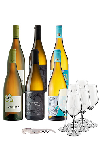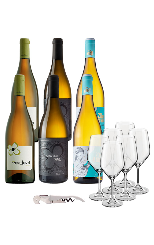 Con este espectacular y asequible pack podrás hacer una degustación de los mejores vinos de la bodega: dos botellas de Verdeal 2022, Dos botellas de Verdeal 500 Flores 2020 y otras dos de 20 de Abril 2022 con el regalo de seis copas de la bodega y un sacacorchos serigrafiado.