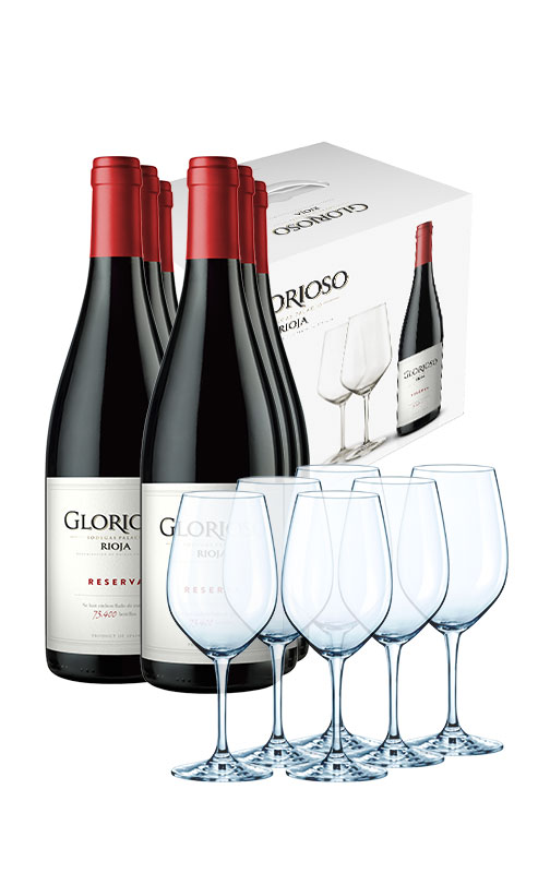 Este pack incluye 6 botellas de Glorioso Reserva 2017, junto con 6 copas, modelo VID de 53 centilítros.
