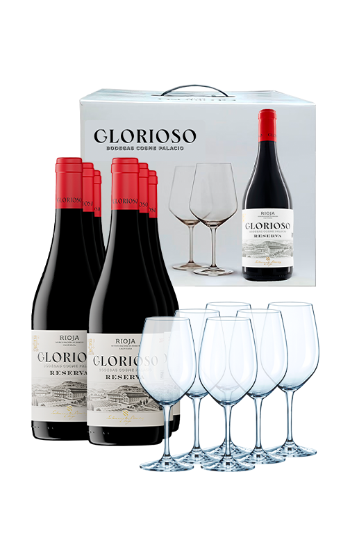 Este pack incluye 6 botellas de Glorioso reserva 2019, junto con 6 copas, modelo VID de 53 centilitros.