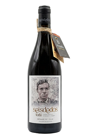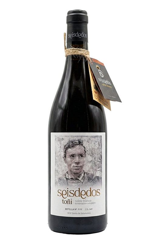 Seisdedos Toñi es un singular monovarietal de Rufete blanca que supone la evolución de Juíta, otro orange wine que esta bodega elaboró en 2021, por lo que hay parámetros que coinciden en ambos vinos. En este caso, este vino fermenta con sus pieles (de ahí su particular color anaranjado) y realiza una crianza de 11 meses en barricas para ganar complejidad de matices, ofreciendo un carácter muy mineral, especiado y balsámico. Su nombre alude a Agustín Maíllo Coscón "Toñí", padre de Agustín Maíllo Seisdedos, y la imagen de la etiqueta pertenece a un retrato realizado por su hermano Florencio que forma parte de la exposición Retrata2-338, y que luce en las fachadas del pueblo de Mogarraz.